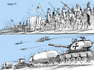 Le traitement du sacrifice de Kadhafi comme une icône confirme le caractère chrétien d'une guerre faite au nom de l'amour des victimes. La destruction de la Libye, par les forces de l'OTAN, s'inscrit dans la longue tradition des croisades, des guerres contre la loi symbolique initiées au nom de l'homme-Dieu [19]. Celles-ci résultaient déjà d'une réorganisation de l'Europe occidentale sous l'autorité du Pape [20]. Aujourd'hui, ce conflit, encore davantage que la guerre en Irak, produit une subsomption totale des pays européens sous l'Empire étasunien.