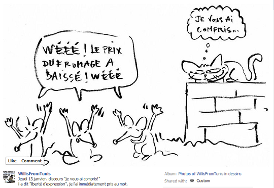 Willis from Tunis est une jeune dessinatrice tunisienne qui s'est engagée par le dessin, le soir du 13 janvier 2011, quand Ben Ali a annoncé la fin de la censure, la liberté de la presse et de l'internet. Elle s'est fait connaître avec son petit chat qui caricaturait ce que vivaient les Tunisiens. Avec la désinformation permanente, on vivait depuis longtemps dans l'humiliation, explique la jeune femme, "même si on partageait déjà beaucoup de choses via Facebook et Twitter".