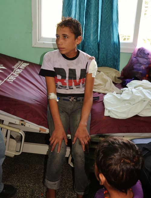 Ce matin, à la frontière d'Eretz, à Beit Hanoun, des soldats israéliens ont tiré sur un garçon de 14 ans, Nedal Khaleel Hamdan. Nous sommes allés à l'hôpital le rencontrer. Nous l'avons trouvé assis sur son lit avec un pansement sur l'épaule, entouré de sa famille.