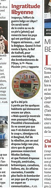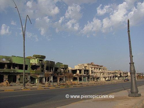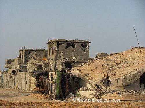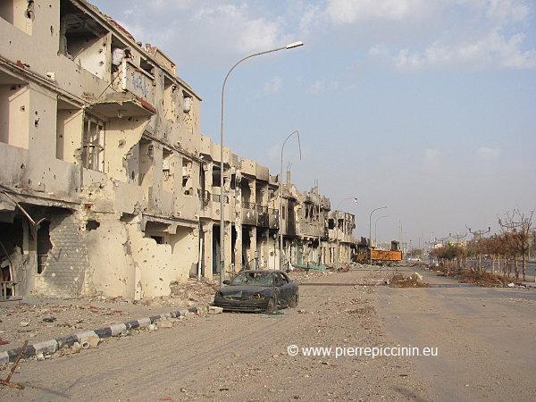 À Syrte, en revanche, il reste réellement très peu d'habitants. Lorsque j'y ai, là aussi, été pris à partie par quelques personnes qui se sont approchées de moi, j'ai donc tenté le dialogue : ces gens m'ont demandé ma nationalité ; je leur ai montré mon passeport belge, et l'ambiance s'est détendue. Ils ne savent pas que la Belgique compte parmi les responsables du désastre qui a détruit leur ville et désolé leur existence ; ils ignorent que les F-16 belges ont été, parmi les avions de l'alliance atlantique, les plus actifs lors des bombardements qui ont dévasté leurs maisons.