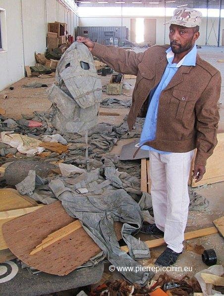Dans l'un de ces hangars, nous avons trouvé des caisses de kalachnikovs et de munitions, du matériel de contre-mesures aériennes, mais aussi un stock de matériel utilisé dans la manipulation et l'emploi d'armes chimiques, de gaz de combat, comme l'ont confirmé les experts militaires à qui j'ai soumis mes photographies : des combinaisons complètes, des masques et différents produits servant à décontaminer et à soigner les personnes atteintes par les gaz.
