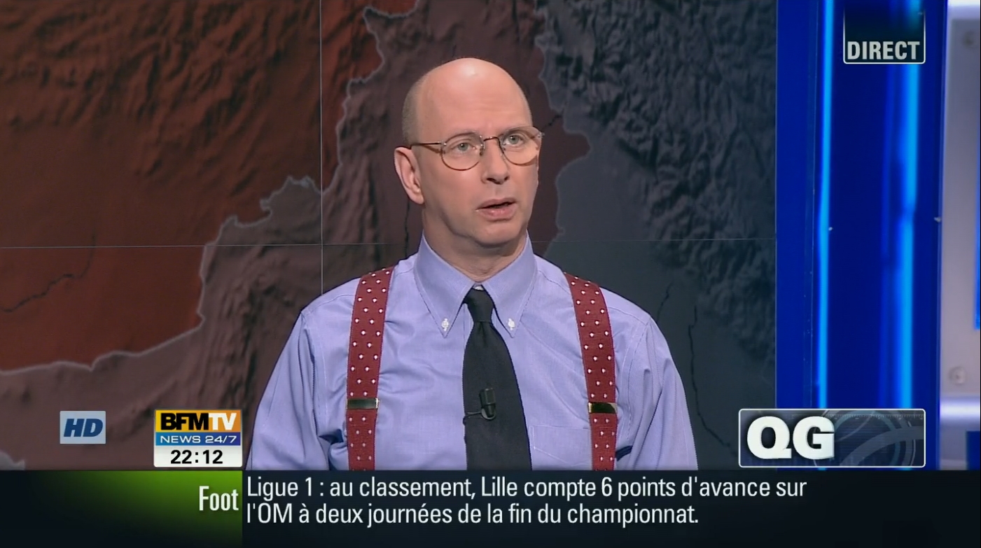 Sur la chaîne concurrente BFM, Olivier Ravanello s'est cependant trouvé un concurrent redoutable en matière de désinformation d'inspiration atlantiste : lundi soir, le présentateur de service du journal de BFM consulte le spécialiste maison, Harod Hyman, exact homologue de Ravanello : en bras de chemise et bretelles, à l'américaine, avec d'ailleurs l'accent anglo-saxon, Hyman se livre à l'aide d'une carte à un cours de géopolitique nettement orienté « à l'ouest ». Citant Alain Juppé il explique que la répression du régime était naguère « violente, perverse mais contrôlée«, et qu'à présent elle est « violente, perverse et incontrôlée ». Heureusement, l'ASL poursuit vaillamment sa mission de « défense des manifestants » syriens « de plus en plus attaqués par l'armée » de Bachar. Et Hyman d'agiter ses bras de chemise pour souligner la gravité de l'heure.