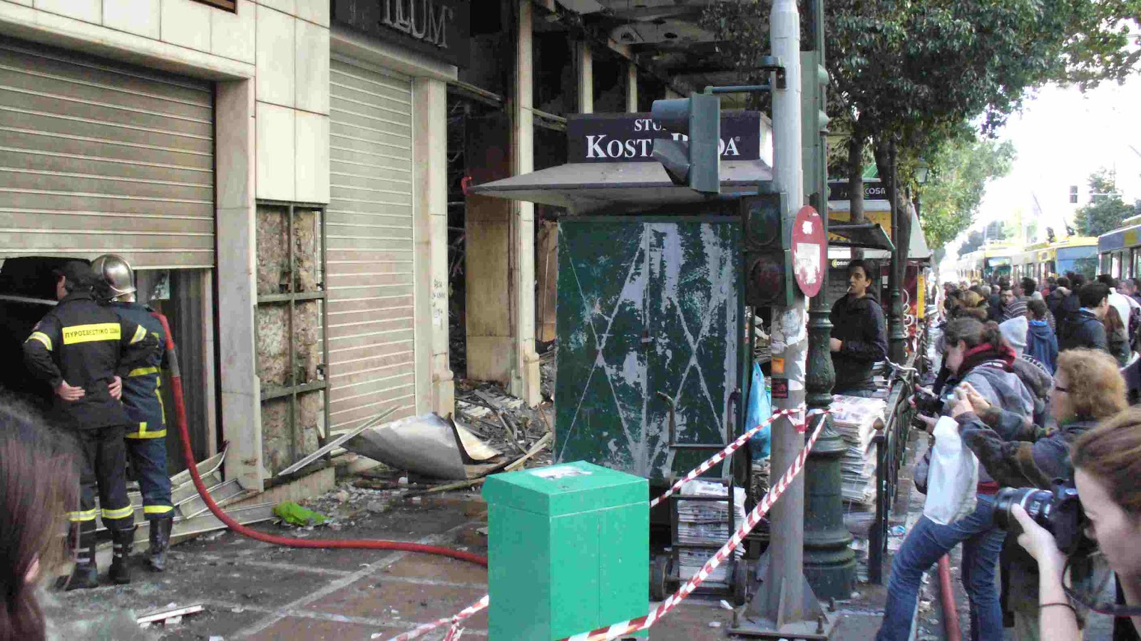 Retour sur Athènes. Retrouvailles sous le signe de la grande fatigue partagée. Les badauds se précipitent devant les débris encore fumants lundi après-midi. La catastrophe dans toute sa pédagogie. Certains incendies ne sont pas encore complètement éteints douze heures après. Impressionnant, choquant et surtout triste. Un homme la cinquantaine commente à haute voix devant le cinéma ravagé par les flammes : « Toujours les mêmes, les anarchistes, ceux qui ne respectent rien, ils faut de l'ordre enfin ». Aussitôt, un autre homme du même âge, laisse exploser sa colère : « Tout cela c'était bien calculé par tes amis au pouvoir, PASOK [P.S.], la droite et les banques, va voter ton PASOK la prochaine fois, le temps où on nous prenait pour des c... c'est terminé, on a pigé ».