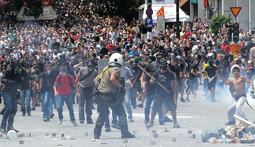 Je ne raconte pas les « incidents » : ils sont sur tous les écrans. On nous parle de la catastrophe provoquée par les casseurs : très probablement, d'une part, des flics provocateurs, comme d'habitude, pour justifier les lacrymos ; cette fois-ci, on tenait l'info d'un jeune cousin - flic - avec qui on a déjeuné juste avant la manif, lui était en arrêt maladie, le veinard... ; d'autre part, les supporters membres des club sportifs Panathinaïkos, Panionios et Olympiakos, ennemis jurés d'habitude, qui avaient décidé une trêve et lancé un appel aux supporters pour se retrouver à Syntagma, alors même qu'un match se tenait, à la même heure. Eux, ou plutôt certains d'entre eux, sont bien entraînés, et ils savent casser, et castagner...