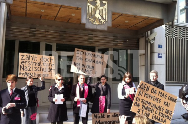 Devant l'ambassade de la Bundesrepublik Deutschland, des Allemands installés en Grèce, ont manifesté également pour faire comprendre qu'au pays de Goethe, la poétique de l'avenir ne se réduit pas aux apostrophes de Madame Merkel ou de Monsieur Schäuble.