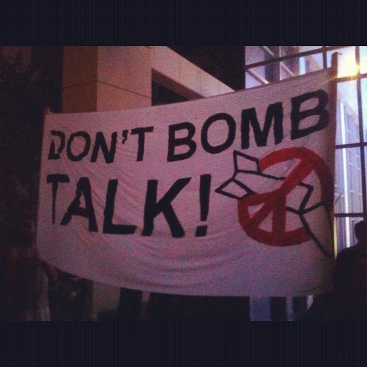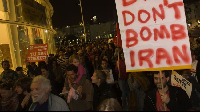 Dimanche soir et mardi soir les slogans fusaient : "Non aux bombardements sur l'Iran !", "Armageddon ? Non merci !" "Un Moyen-Orient sans nucléaire !", tandis que les manifestants tournaient autour de ce luxueux building occupés par nombre de magnats israéliens.