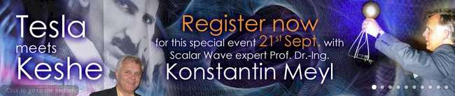 Le prochain événement public sera Septembre 21, quand la Fondation sera en vedette le professeur Konstantin Meyl, qui permettra d'examiner et expliquer les différences et les similitudes entre la technologie et de la technologie Tesla Keshe. Il s'agit d'un événement enseignement dans leur auditorium installation qui peut accueillir 1000 personnes un cents. Il n'est pas conçu pour être un sport de démonstration. Keshe dit qu'ils ne sont pas annoncer les événements où ils démontreront la technologie auprès du public, parce que chaque fois qu'ils le font, ils ont eu la douleur par divers organismes gouvernementaux. «Si nous montrer, nous ne serons pas annoncer." Voici la bannière qu'ils ont sur leur page d'accueil annonçant cette manifestation.