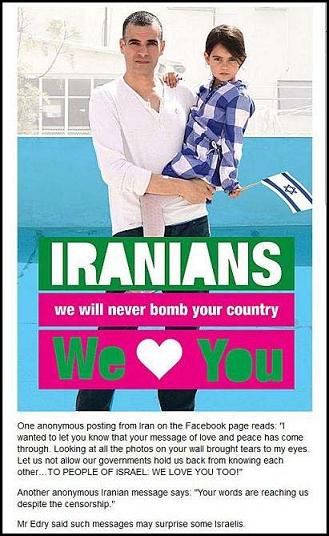 Une image mise sur le réseau social Facebook et sur le web « Israel loves Iran » par Ronny Edry, dessinateur graphique, instituteur et citoyen Israélien, est devenue une mobilisation cybernéticienne, avec des soutiens partout dans le monde, image qui exprime l'amour entre israéliens et iraniens et sa recherche de paix. Avec plus de 700 000 reprises dans sa version originale et près d'un million de visite pour la version sous-titrée en espagnol, la vidéo « maison » qui résume la campagne montre la progression d'un mouvement qui cherche à sortir d'Internet et à tapisser les rues de la ville de Tel Aviv.Il y a cinq mois, dans une vidéo mise sur YouTube, le dessinateur graphique de 41 ans a résumé son idée en moins de deux minutes. « C'est un message des gens et pour des gens », a-t-il prévenu. « Dernièrement, les nouvelles parlent de guerre. Une Grande. Ils ont l'habitude de parler de destruction, d' auto-défense, comme si ce n'était pas notre sujet. Il y a trois jours j'ai publié une image sur Facebook avec un message simple : Iraniens, nous n'allons pas vous bombarder. Nous vous aimons », a déclaré Edry. « Aux gens d'Iran : à tout père, mère, fils, frère et sœur, pour qu'il y ait une guerre entre nous, d'abord nous devons avoir peur l'un de l'autre. Nous haïr. Je n'ai pas peur et je ne vous déteste pas. Je ne vous connais même pas. Jamais un iranien ne m'a fait de mal », a-t-il ajouté. Dans la vidéo « maison » Ronny a révélé qu'il a connu une fois un iranien dans un musée à Paris ce qu'il se rappelle comme « un grand sujet ». Il a aussi raconté que parfois il voit un iranien à la télévision et qui parle de guerre. « Mais je suis sûr qu'il ne représente pas tous les gens d'Iran. Si vous voyez quelqu'un à la télévision parlant de vous bombarder je vous assure qu'ils ne représentent pas tous les gens d'Israël », avertit t-il. Par la force de son idée, il a expliqué la vitesse et la répercussion surprenante du message. « En à peine 24 heures les gens ont commencé à partager l'image sur Facebook. En 48 heures, les gens d'Iran ont commencé à répondre à l'image et à partager leur amour avec nous. Des centaines de messages sont arrivés depuis l'Iran, disant aux gens d'Israël : nous vous aimons aussi », a-t-il précisé.