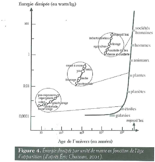 L'astrophysicien américain Eric Chaisson a montré en 2001 qu'au fil de l'histoire de l'univers sont apparues des structures capables de dissiper l'énergie toujours plus efficacement, en rapportant leur production d'énergie libre à leur masse :