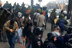 A moment donné le mur de policiers s'est entre ouvert, a laissé passer les hommes au bandeau rouge puis s'est refermé. Une vidéo montre alors un homme qui se tient derrière la rangée de policiers et qui tire sur les manifestants pro-Kiev.
