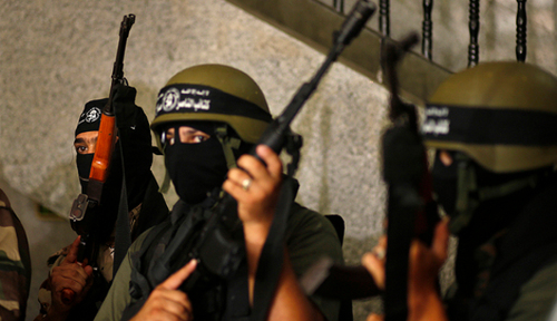 Des militants palestiniens des Brigades Al-Nasser brandissent des armes lors d'une conférence de presse dans la ville de Gaza, le 5 juillet 2014 - Photo : Reuters/Mohammed Salem