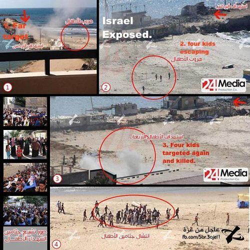 L'armée de l'occupation israélienne a tué 6 enfants palestiniens ce mercredi 16 juillet 2014 alors qu'ils jouaient sur la plage de Gaza. Ces enfants avaient entre 9 et 12 ans [tous de la famille Baker : Ayed (10 ans), Zakaria (10 ans), Ramez (11 ans) et Mohammed (9 ans)]. Ils jouaient le football sur les sables de la plage de Gaza.
