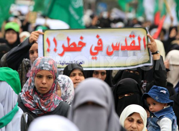 Des femmes palestiniennes participent à un rassemblement organisé par le Hamas à Gaza, en signe de solidarité avec la mosquée Al-Aqsa à Jérusalem. La banderolle dit : "Al-Qods est en danger"