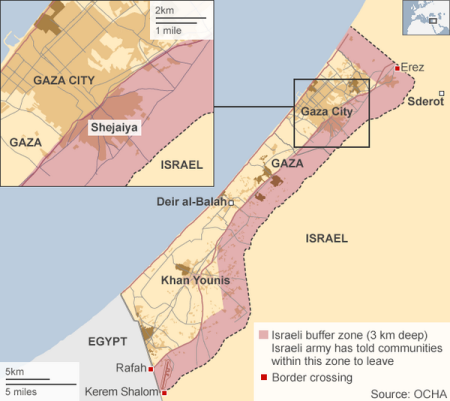 Beit Hanoun, Gaza - Cette étroite bande de terre que l'on appelait "la bande de Gaza», déjà l'un des endroits les plus densément peuplées de la planète, est en train de devenir considérablement plus petite. L'armée israélienne, sans relâche et méthodiquement, repousse les gens hors de la zone tampon de 3 km dont elle dit avoir besoin pour se protéger contre les roquettes et les tunnels du Hamas. Selon le Bureau des Nations Unies pour la coordination des affaires humanitaires, la zone tampon avale environ 44 pour cent du territoire de Gaza (cf. carte en fin d'article).