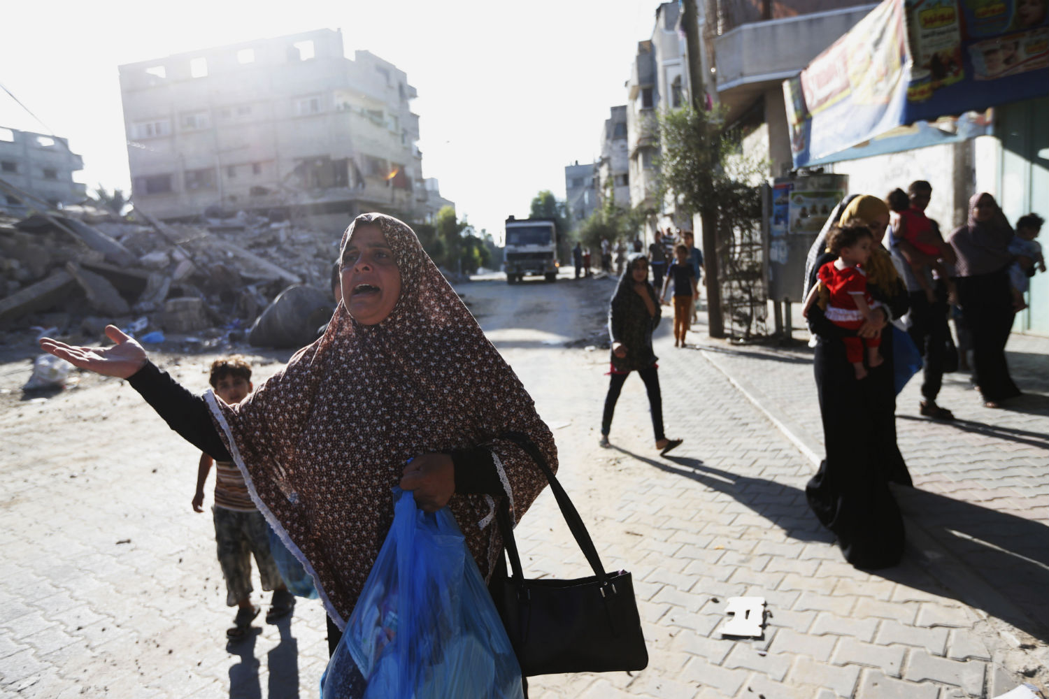 Des Palestiniens fuient leurs maisons dans le quartier de Shujaiyeh à Gaza-Ville.16 Juillet 2014. (PhotoLefteris Pitarakis/AP