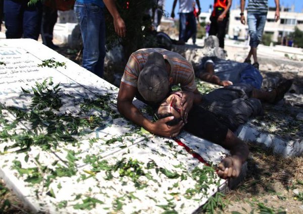 Israël tue les Palestiniens, puis, comble de la cruauté, bombarde les cortèges funéraires.. Ici un Palestinien pleure sur le corps de l'un des trois hommes assassinés dans un cimetière, après une attaque militaire israélienne sur la ville de Gaza, le 21 août 2014 - Photo : AFP/Ali Hassan