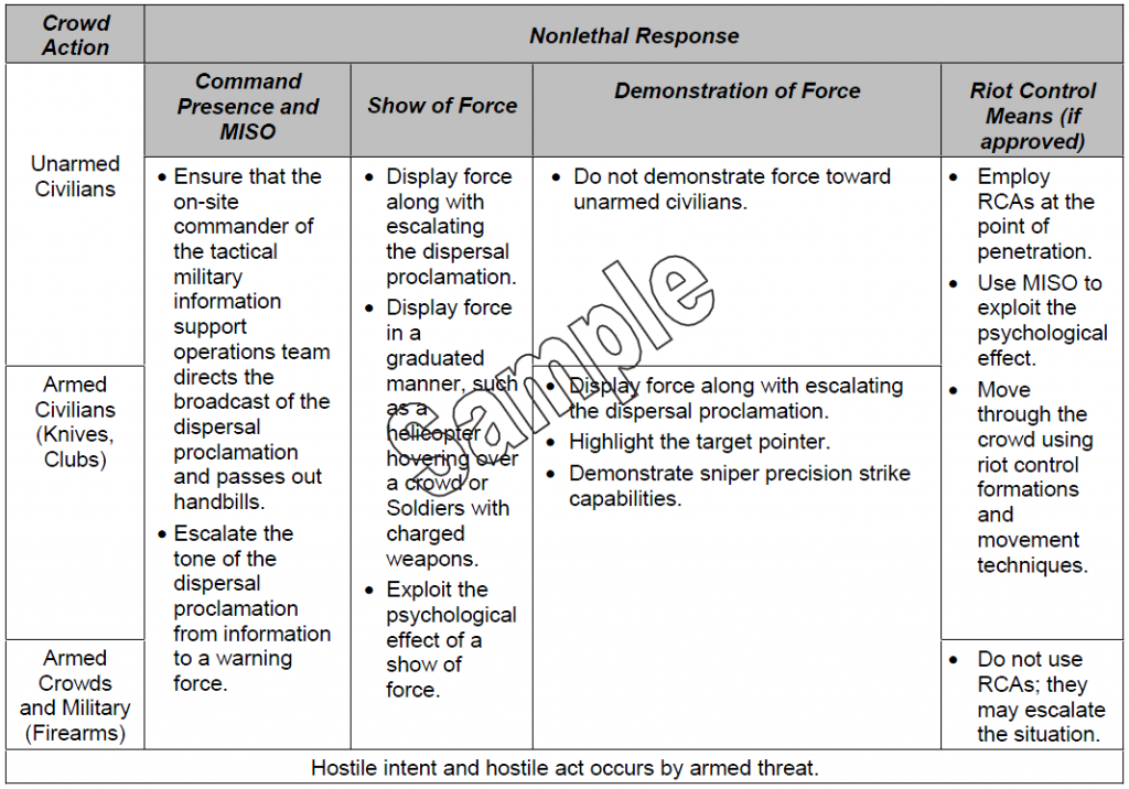En tenant compte de la caractéristique des événements de Ferguson, dans lequel la communauté afro-américaine a dû faire face à une police militarisée, il convient de souligner le fait que le manuel avertit que l'agitation peut résulter de la haine ethnique ou de «questions sociales ou économiques hautement émotionnelles ».