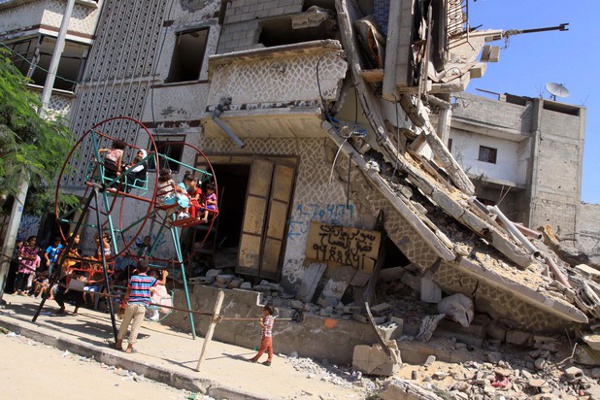Le deuxième jour de la fête musulmane de l'Aïd al-Adha, des enfants palestiniens jouent dans ce qu'il subsiste du quartier al-Shujaiya à l'est de la ville de Gaza après les bombardements israéliens - Photo : APA/Mohammed Asad