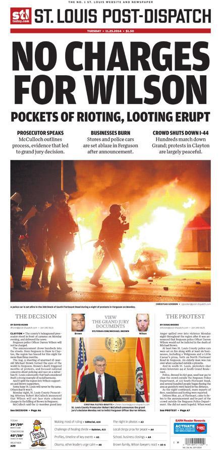 La police a fait également état de plusieurs scènes de pillages au nord de cette banlieue de St Louis. Ailleurs, aux Etats-Unis, notamment à Times Square à New York mais aussi dans la capitale fédérale, des milliers de manifestants ont protesté contre, selon eux, ce déni de justice. Devant la Maison Blanche, la foule brandissait des pancartes réclamant «Justice pour Mike Brown » et scandant «les mains en l'air, ne tirez-pas».