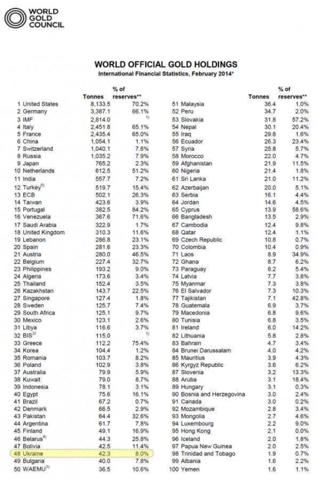 Dans une interview sur Ukraine TV , la Direction de la Banque centrale d'Ukraine elle-même a fait l'aveu étonnant que « dans les coffres de la Banque Centrale, il n'y a presque plus d'or. Il reste une petite quantité de lingots d'or, mais ce n'est que 1 % des réserves. »