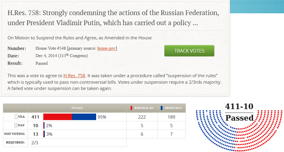 La résolution 758 condamnant les actions de la Russie a été votée par le Congrès des états-UnisCette résolution, soumise aux votes seulement deux semaines après sa présentation, dépeint la Russie comme un pays agresseur qui a envahi l'Ukraine et a abattu le vol MH17.