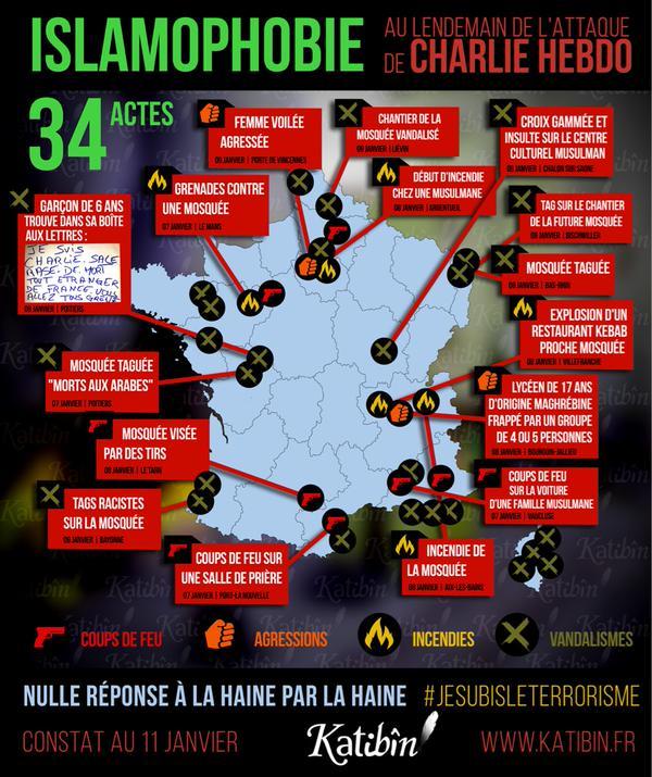Si nous condamnons bien évidemment les attaques terroristes des frères Chouaki et de Coulibaly, nous condamnons aussi les actes anti-musulmans qui s'en sont suivis, de surccroit, nombreux. Au total, ce sont 34 atteintes en 4 jours. Intolérable.