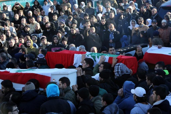 Dimanche 11 janvier 2015 - La foule en deuil porte les cercueils des victimes de deux attaques-suicide près d'un café très fréquenté dans le quartier Jabal Mohsen de Tripoli - Photo : Al-Akhbar/Marwan Tahtah