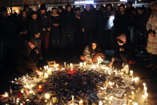 Photo : Place de la République, Paris, 7 janvier 2015, rassemblement après l'attentat contre Charlie Hebdo © Daniel Maunoury