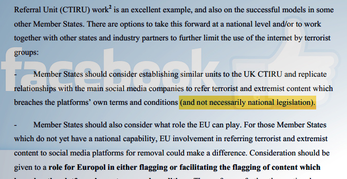 Le rapport du coordinateur de l'Union européenne pour la lutte contre le terrorisme propose que les Etats tirent profit des conditions générales des réseaux sociaux pour obtenir sans procès la censure de contenus qui ne sont pas illégaux aux yeux de la loi, mais qui peuvent contrevenir aux contrats signés par les internautes. Où quand l'Etat et les géants du web se livrent à une valse pour contourner le respect des des droits fondamentaux.