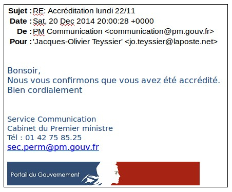 Silence de la préfecture. Je m'adresse alors directement à Matignon, en prenant bien soin de joindre les échanges indiquant que je n'ai pas de carte de presse, pour savoir si je suis accrédité. Réponse du cabinet du premier ministre : « Nous vous confirmons que vous avez été accrédité. » Pourtant, à en croire la préfecture, il fallait « impérativement » le numéro de carte de presse.