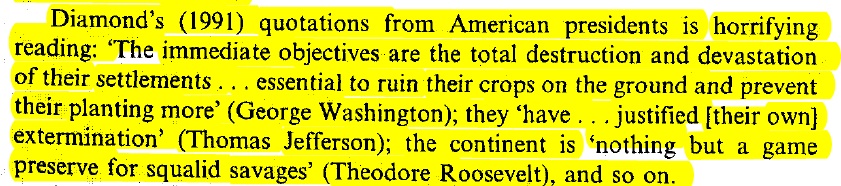 In fact, President Thomas Jefferson himself famously said (well, famous throughout Native America) that the "(American Indian has) justified (their own) extermination." And it was George Washington who thought the only way to kill Native Americans was to rage war on their crops.