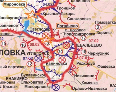 Dans la nuit de 9/10 février 2015, une autre action offensive des séparatistes a eu comme but la prise de la localité Myronivka, située à 13 km. Nord de Debaltseve, Myronivka étant située à l'entrée dans la poche créée par l'armée ukrainienne dans son offensive de l'été 2014. Le 10 février 2014, au matin, les séparatistes ont réussi l'encerclement d'autres 2000 militaires ukrainiens (approximativement une brigade), disposés entre Myronivka et Debaltseve. Dans ces conditions, Barrak Obama menace la Russie et semble décidé d'armer l'Ukraine d'un armement moderne. Simultanément, un nouveau cycle de négociations débute à Minsk, au sujet d'un nouvel armistice dans le Sud-Est de l'Ukraine.