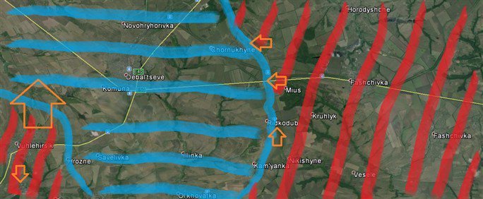 Le 9 février 2015, les rebelles séparatistes ont déclenché une puissante action offensive par surprise, sur le flanc droit - direction Nyzhnje Lozove-Logvinovo, ayant la couverture de feu assurée par plusieurs obusiers autopropulsés 2S1 Gvozdika, cal. 122 mm. Jusqu'à la tombée du soir, les forces séparatistes ont dépassé l'alignement de l'autoroute E40, tout en réalisant la jonction avec les sous-unités séparatistes du flanc gauche. A partir de ce moment-là, les effectives des deux brigades de l'armée ukrainienne ont été encerclés. (voir Debaltseve3).