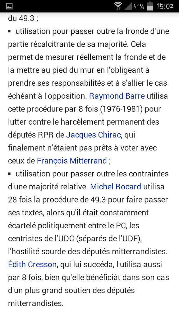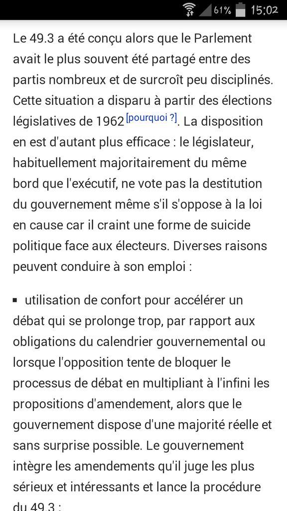 ·16h29 Maneul Valls engage la responsabilité du gouvernement et annonce le passage en force de la Loi Macron grâce au 49.3François Hollande à propos du 49-3, en 2006 : "C'est une violation des droits du Parlement, une brutalité, un déni de démocratie"15h25 - Jacob: Si 49-3 dépôt d'une motion de censure de l'UMP.15h00: Débats de 2 heures à l'Assemblée pour rien, a priori. L'Elysée a juqu'à 16 heures.14h53: L'UDI ne votera pas la confiance au gouvernement
