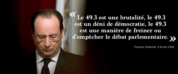 Le 49-3, envisagé mardi pour faire passer la loi Macron à l'Assemblée nationale, était particulièrement dans le viseur de celui qui est désormais à l'Elysée. "Tout ce qui concourra à l'affermissement des pouvoirs du Parlement aura notre agrément", estimait-il, citant la "suppression de l'article 49-3" ou celle du "vote bloqué" et "de la procédure d'urgence". François Hollande déplorait même "la timidité du président qui n'a(vait) évoqué par exemple la suppression de l'article 49-3 que pour exprimer sa propre 'réserve'".