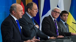 Laurent Fabius, Ministre des Affaires étrangères de France (Gauche), Pavlo Klimkin, ministre des Affaires étrangères de l'Ukraine (Droite), Frank-Walter Steinmeier, ministre des Affaires étrangères de l'Allemagne, (2ème R) et Sergueï Lavrov, ministre des Affaires étrangères de la Russie. (Reuters / Thomas Peter)