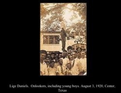 (7) L'origine du mot « lynchage » est controversée. Certains l'attribuent à William Lynch (1742-1820), d'autres à Charles Lynch (1736-1796), d'autres encore citent Willy (ou Willie) Lynch auteur présumé d'un texte de 1712 où il explique comment briser la résistances des esclaves noirs. Mais dans tous les cas le terme « lynchage » désigne des exécutions sommaires et barbares se généralisant au sud des États-Unis notamment pour mieux soumettre la population noire.