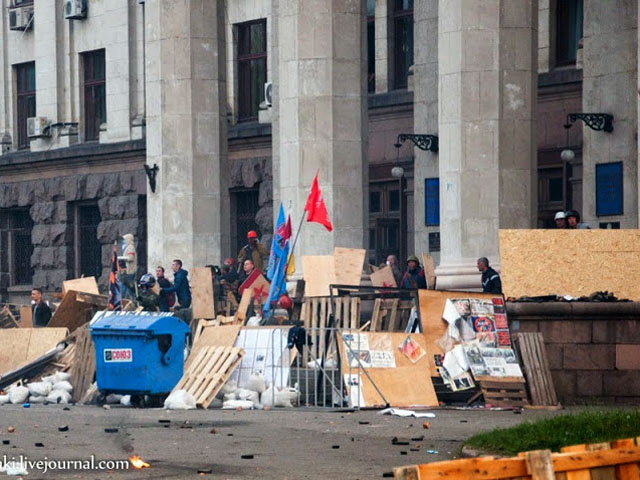 Tout d'abord, deux jours avant les événements, il y eut une caméra vidéo qui fut installée sur le bâtiment d'en face. Ils avaient prévu de tout filmer (ce qui fut fait), il était programmé de faire une émission télévisée (NDT : émission Schuster.life présentée par le présentateur Shuster bien connu en Ukraine) et ils voulaient montrer les images en direct. Lors de cette émission, ils ont tout filmé, regardé comment la Maison des Syndicats brûlait. Après, il y a aussi eu des gens qui sont venus et qui fouillaient les poches des cadavres et des blessés. Ils cherchaient des citoyens russes. Ils ont pris les clefs de sa voiture à un camarade qui était blessé ce qui lui a sauvé la vie, elles étaient sur un porte-clefs de valeur. Un des ultras du Pravy Sektor s'est emparé de cet objet en parlant avec un fort accent géorgien, en disant « c'est mon trophée ! », puis l'a tiré dans la rue pour qu'il lui montre où se trouvait la voiture. Plus loin, il y avait sa femme et son fils adulte qui étaient dans la rue ce qui lui a permis de s'échapper. Il a pu sauter dans une ambulance et il est parti. Il avait été intoxiqué par les fumées des gaz, il a donc demandé de s'arrêter devant une ambulance pour respirer de l'oxygène pour reprendre son souffle, c'est à cette occasion qu'il a pu s'enfuir en sautant dans l'ambulance.