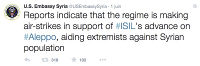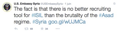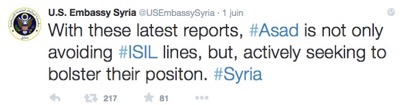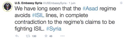 L'ambassade des États-Unis à Damas, qui a repris son fonctionnement depuis Washington sur le web, a diffusé le soir du 1er juin 2015 (c'est-à-dire avec le décalage horaire juste avant la réunion de la Coalition anti-Daesh à Paris) des messages Twitter accusant sans indice, ni logique, la Syrie de soutenir Daesh.