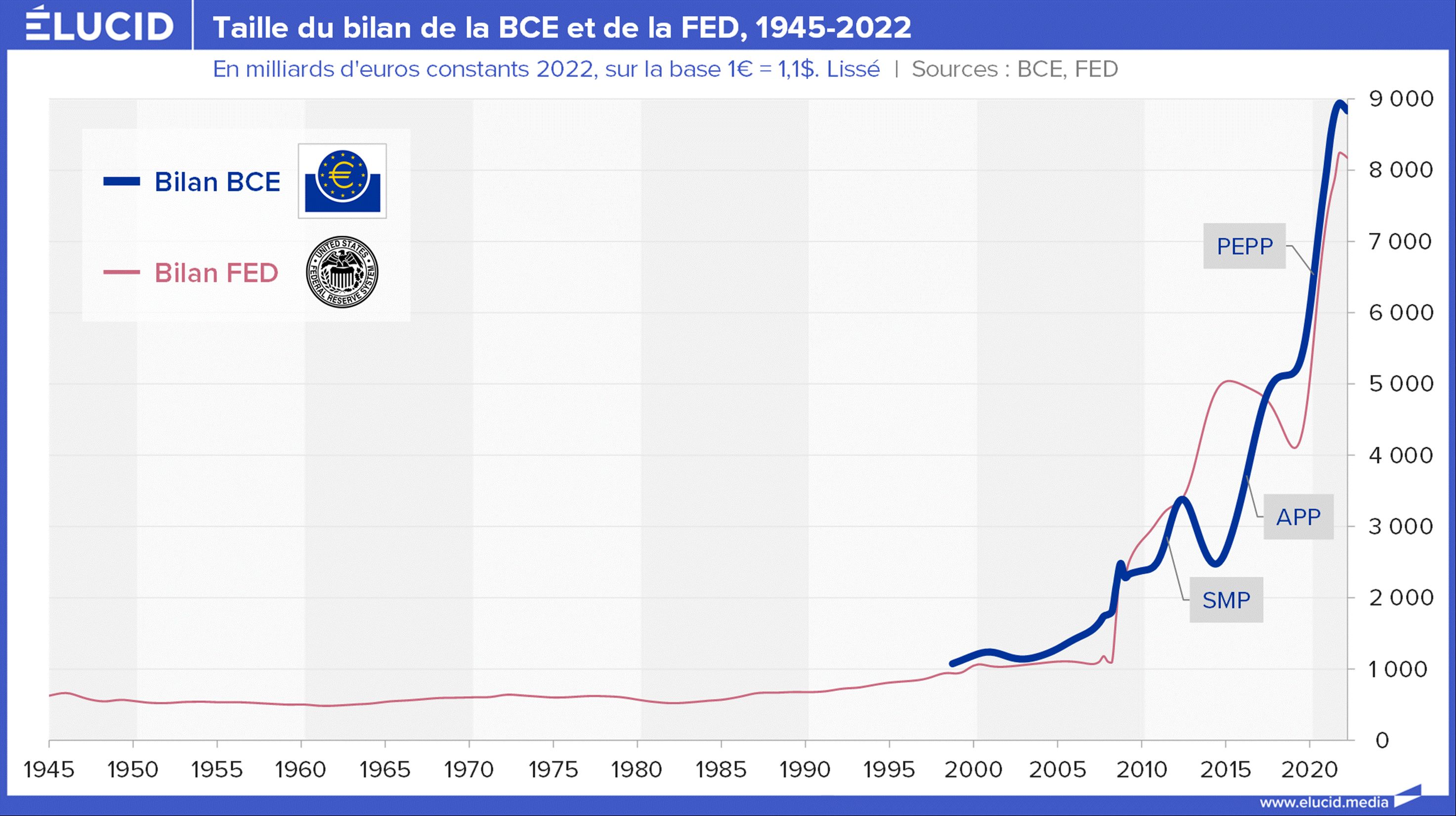 La BCE a réalisé cette création monétaire par le biais de deux programmes d'achats, qui ont augmenté la masse monétaire. Le premier, appelé Programme d'Achats d'Actifs (APP), a commencé fin 2014 et n'a pas cessé depuis lors ; il a concerné jusqu'à 80 milliards d'euros (Md€) d'achats mensuels en 2015 et 2016, et le total actuel dépasse 3400 milliards. Le second est le Programme d'achats d'urgence face à la pandémie (PEPP) qui a commencé en 2020 pour faire face aux énormes besoins financiers des États ; il a concerné jusqu'à 140 Md€ d'achats mensuels, et le total actuel dépasse 1700 milliards d'euros.