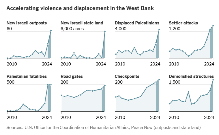 Selon les données des Nations Unies, cette année a été parmi les plus violentes jamais enregistrées en matière d'attaques de colons israéliens contre les Palestiniens en Cisjordanie, avec plus de 750 blessés. Cette violence coïncide avec une expansion rapide des avant-postes de colons sur des terres que les Palestiniens considèrent comme essentielles à tout futur État.