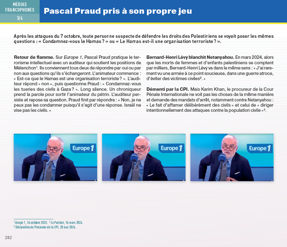 Ils ont accordé une large tribune à des négationnistes du génocide tels que Caroline Fourest et Georges Bensoussan, leur offrant un temps d'antenne long et sans contradiction. Fourest - omniprésente malgré son usage répété de désinformation, souvent dirigée contre les musulmans et en défense d'Israël - a nié le blocus humanitaire imposé par Israël et affirmé que le Hamas mas détournait la nourriture et l'aide. Elle a aussi prétendu que les morts palestiniennes étaient surestimés et devaient être « divisées au moins par cinq, voire par dix », ignorant que ces chiffres sont largement considérés comme fortement sous-estimés.