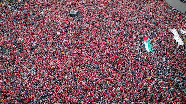 Des dizaines de milliers de personnes ont envahi les rues d'Amsterdam, aux Pays-Bas, pour commémorer les deux ans du début du génocide israélien à Gaza et exprimer leur soutien au peuple palestinien.