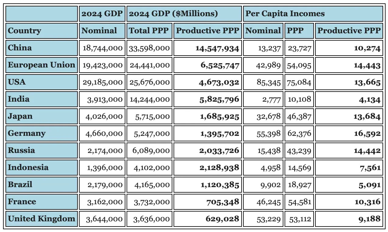 Le mois dernier, j'ai mis à jour les estimations internationales standard de la puissance économique des principaux pays et blocs mondiaux, afin d'y intégrer les dernières statistiques financières pour 2024. Ces chiffres ont simplement confirmé que le potentiel productif réel de l'économie chinoise, parfois considéré comme la mesure la plus fiable de la puissance économique internationale, surpasse désormais largement celui de l'ensemble de l'Occident, y compris avec notre vassal japonais :
