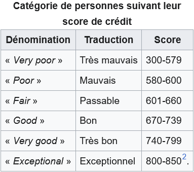 Aux États-Unis, le score de crédit, «credit score», existe depuis longtemps et sert d'indicateur accessible à tout organisme vendeur ou bailleur pour estimer la solvabilité financière d'un client, et donc la capacité de ceux-ci à rembourser leurs emprunts. En fonction de cette valeur, un organisme peut décider d'un taux de remboursement, d'une limite sur les cartes de crédit ou de la nécessité ou non d'avoir besoin d'un garant pour un achat important. Le score de la personne est regardé presque systématiquement par le futur créancier pour s'assurer de la capacité de l'emprunteur à rembourser les crédits, mais aussi du comportement de celui-ci dans sa régularité à payer les échéances.