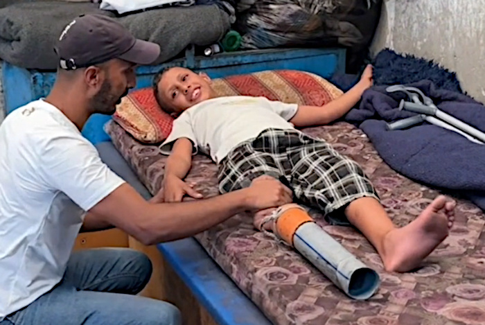 Deir al-Balah, novembre 2025 - Rateb Abu Qleiq, âgé de 10 ans, s'est fabriqué une prothèse de fortune à partir d'un tuyau d'égout en plastique après avoir été amputé de la jambe droite à la suite d'une frappe aérienne israélienne - Photo : extrait vidéo Abdel Qader Sabbah
