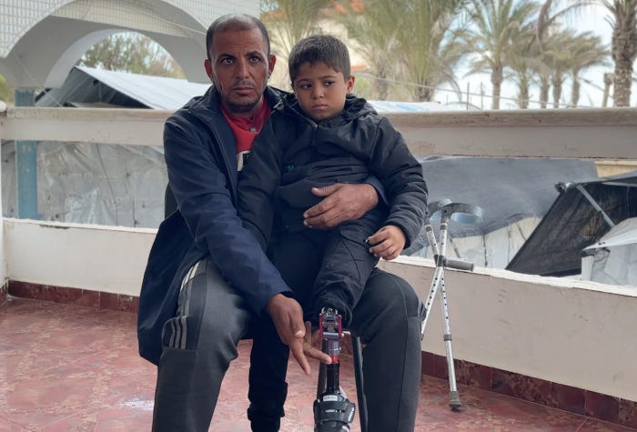 Novembre 2025 - Ahmad Murad Ashour, 5 ans, a été amputé de la jambe gauche au niveau du genou après avoir été blessé lors d'une frappe aérienne israélienne en avril 2025. Il a été équipé d'une prothèse à l'hôpital Hamad d'Al-Zuwaida - Photo : extrait vidéo Abdel Qader Sabbah