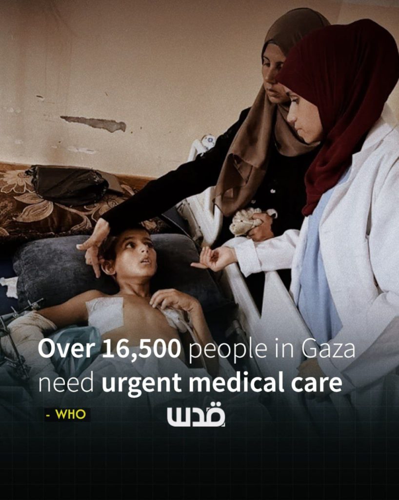 Le directeur général de l'Organisation mondiale de la santé (OMS), le Dr Tedros Adhanom Ghebreyesus, a déclaré que plus de 16.500 personnes à Gaza ont besoin de toute urgence de soins médicaux vitaux indisponibles à l'intérieur du territoire assiégé, qualifiant la situation de « course contre la montre et la conscience de l'humanité ».