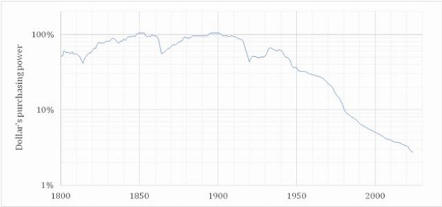 Figure: The dollar's purchasing power, 1800-2024. Semilog plot using CPI data, scaled so purchasing power was 100% in 1894.