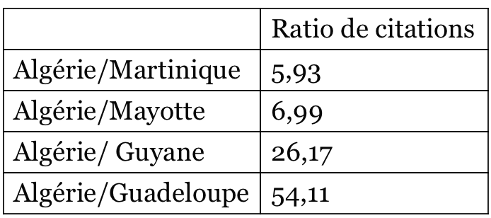Tableau 4 : Ratio comparatif des citations par CNews entre l'Algérie d'une part et des DROM d'autre part.